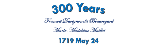 2019 is a special year for the family as it marks the 300th anniversary of the marriage of the progenitor of the first and largest line of Davignons on the continent. François Davignon dit Beauregard married Marie-Madeleine Maillot dit Laroche on the 24th of May in 1719 at the parish of St. Joseph in the town of Chambly, Chambly County, Quebec Province, Canada. You can find more information about François and his immediate family by following the link to his page.